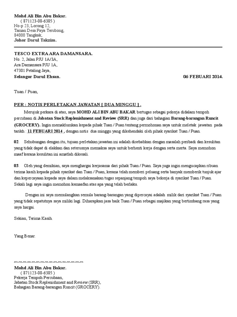 Contoh Surat Berhenti Kerja Malaysia - Nusagates